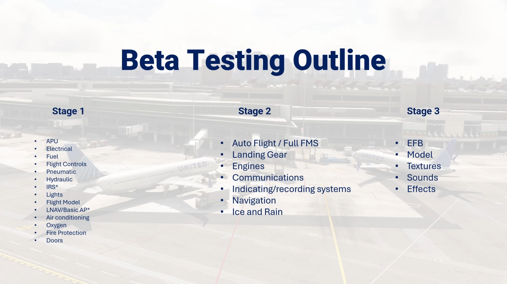 Le plan de test bêta décrit les différentes étapes par lesquelles passera l’avion. Il y a trois étapes; étape 1 travaillera sur de nombreux éléments plus petits mais vitaux, tels que l’APU, l’électricité, le carburant, les commandes de vol, la pneumatique, l’hydraulique, les IRS, les lumières, le modèle de vol, etc. Étape 2 s’appuie sur cette base pour travailler sur des systèmes plus complexes, tels que la fonctionnalité Auto Flight / Full FMS, les moteurs, les communications, la navigation, etc.