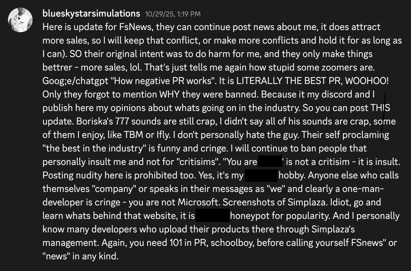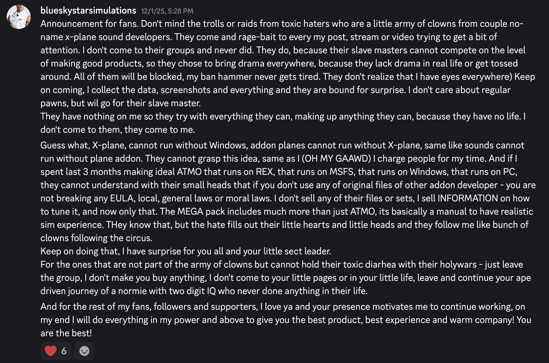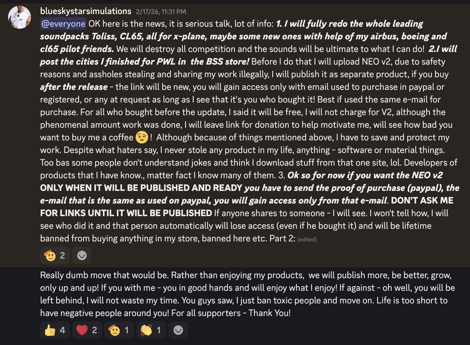 Le 17 février 2026, BlueSkyStar Simulation (BSS) s’est rendu sur son serveur Discord pour annoncer une liste de produits payants à venir pour X-Plane 12. L’annonce comprenait une multitude de nouveaux développements de BSS ainsi que de nouvelles politiques du développeur destinées à lutter contre le piratage et à lutter contre les trolls et le harcèlement.