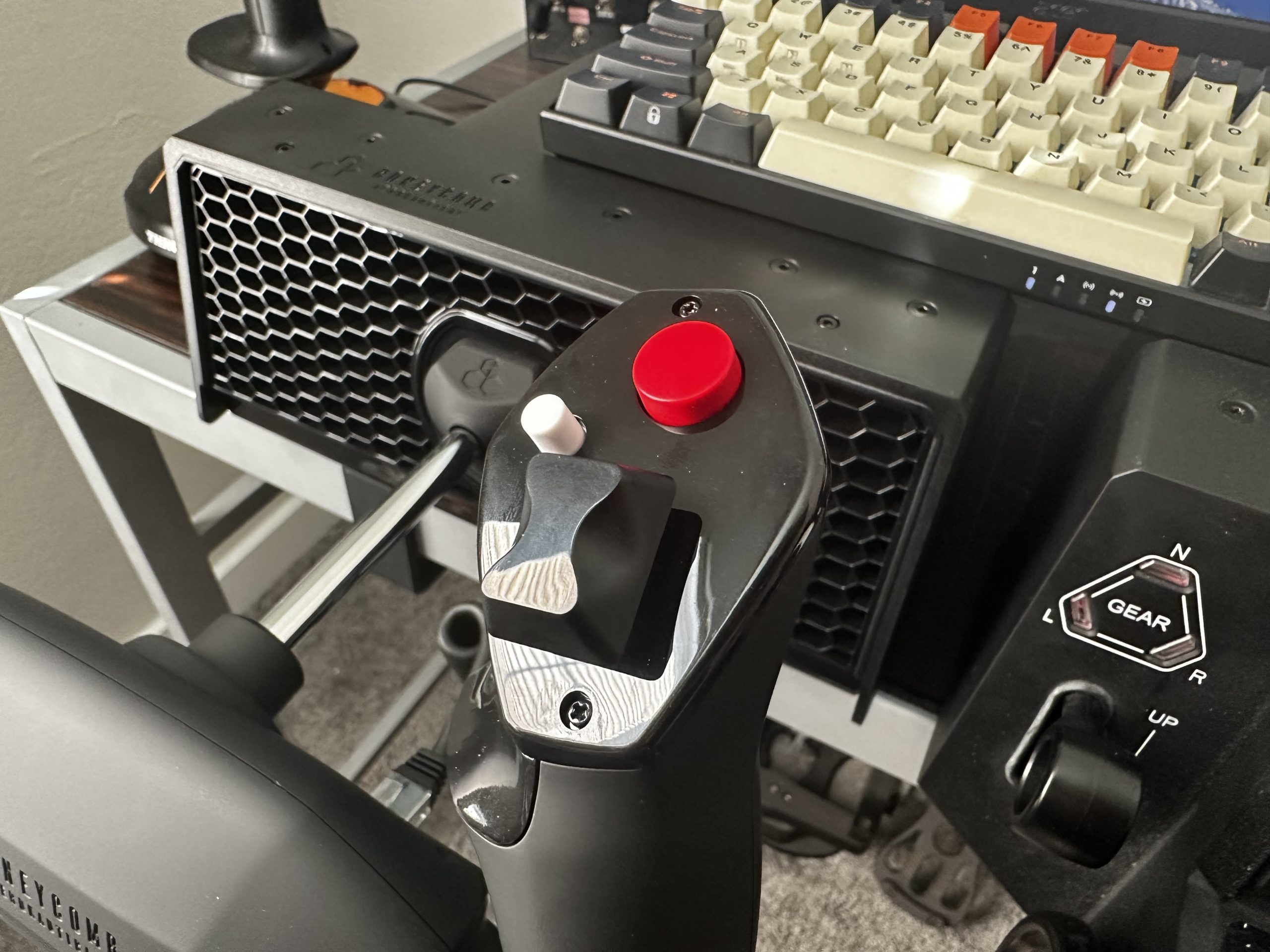 Les poignées à empiècement ont les seuls boutons que vous trouverez sur l’appareil. La poignée gauche est dotée d’un interrupteur à chapeau pour les vues, d’un interrupteur à trois positions pour le trim de l’ascenseur, d’un bouton blanc sur le dessus de la poignée et d’un bouton à l’arrière de la poignée, qui peut être pratique pour appuyer pour parler. La poignée droite comporte un autre interrupteur à trois positions pour le trim du gouvernail ou des ailerons, un gros bouton rouge et un plus petit bouton blanc.