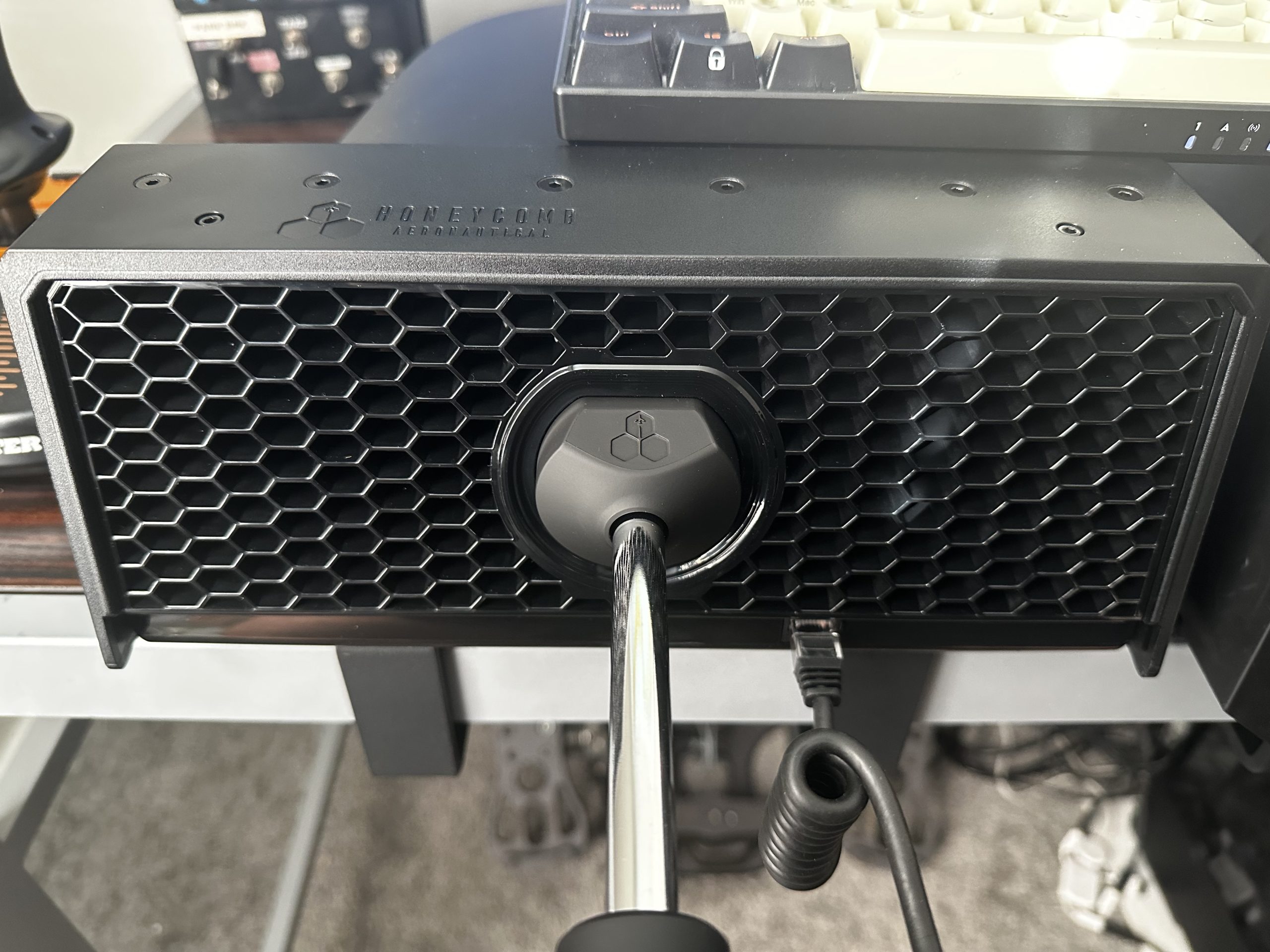 L’arrière de l’appareil n’a que le port de sortie USB-C. Je tiens à féliciter Honeycomb pour avoir pris la décision de conception de doter tous ses produits de câbles amovibles. Cela signifie que retirer le joug de la table après utilisation est beaucoup plus facile, car vous n’avez pas besoin d’atteindre l’arrière de votre ordinateur pour le déconnecter à chaque fois. Cela signifie également que si le câble fourni est endommagé, vous pouvez utiliser n’importe quel autre câble USB-C pour le connecter à l’ordinateur. Dans l’ensemble, une excellente fonctionnalité de qualité de vie.
