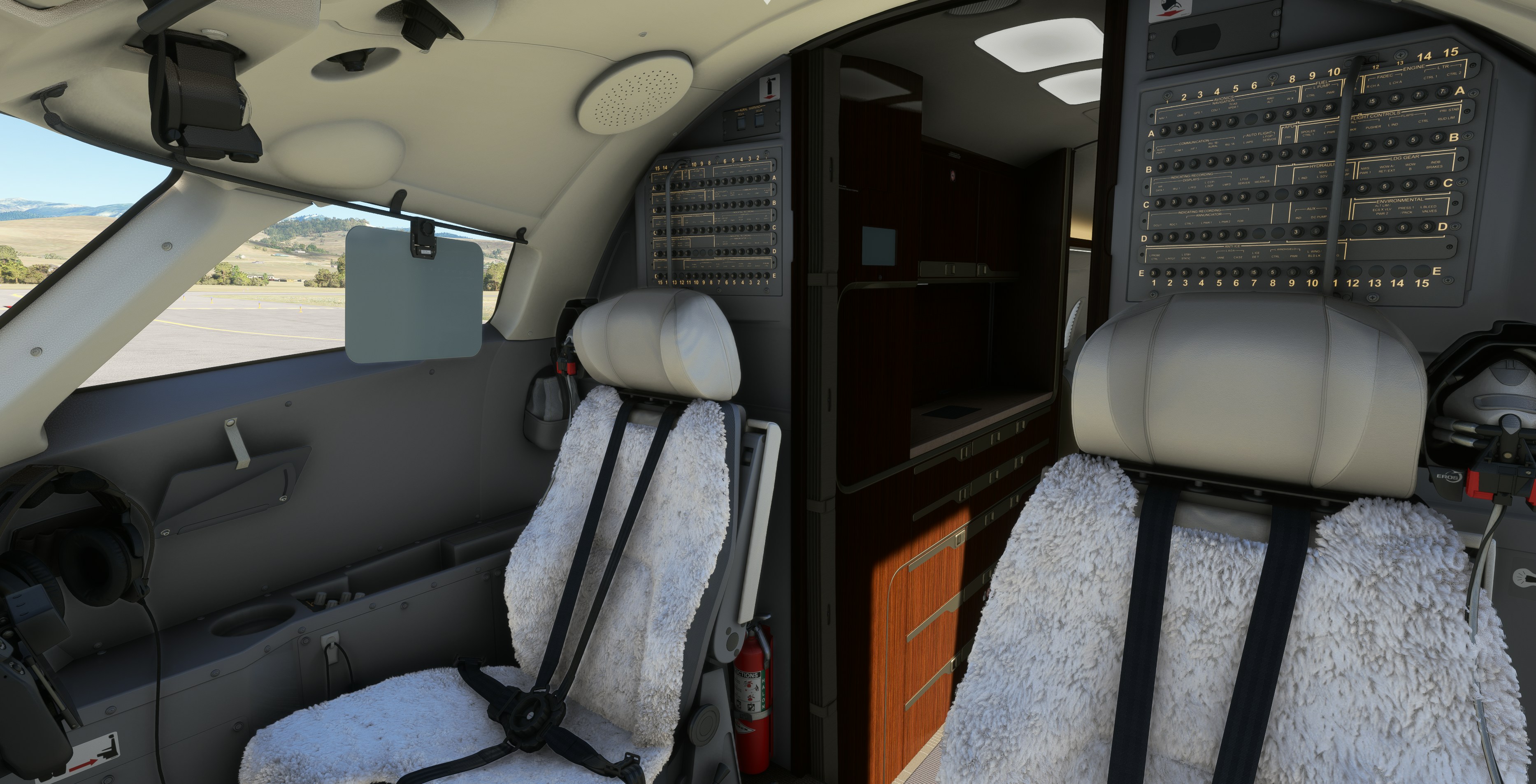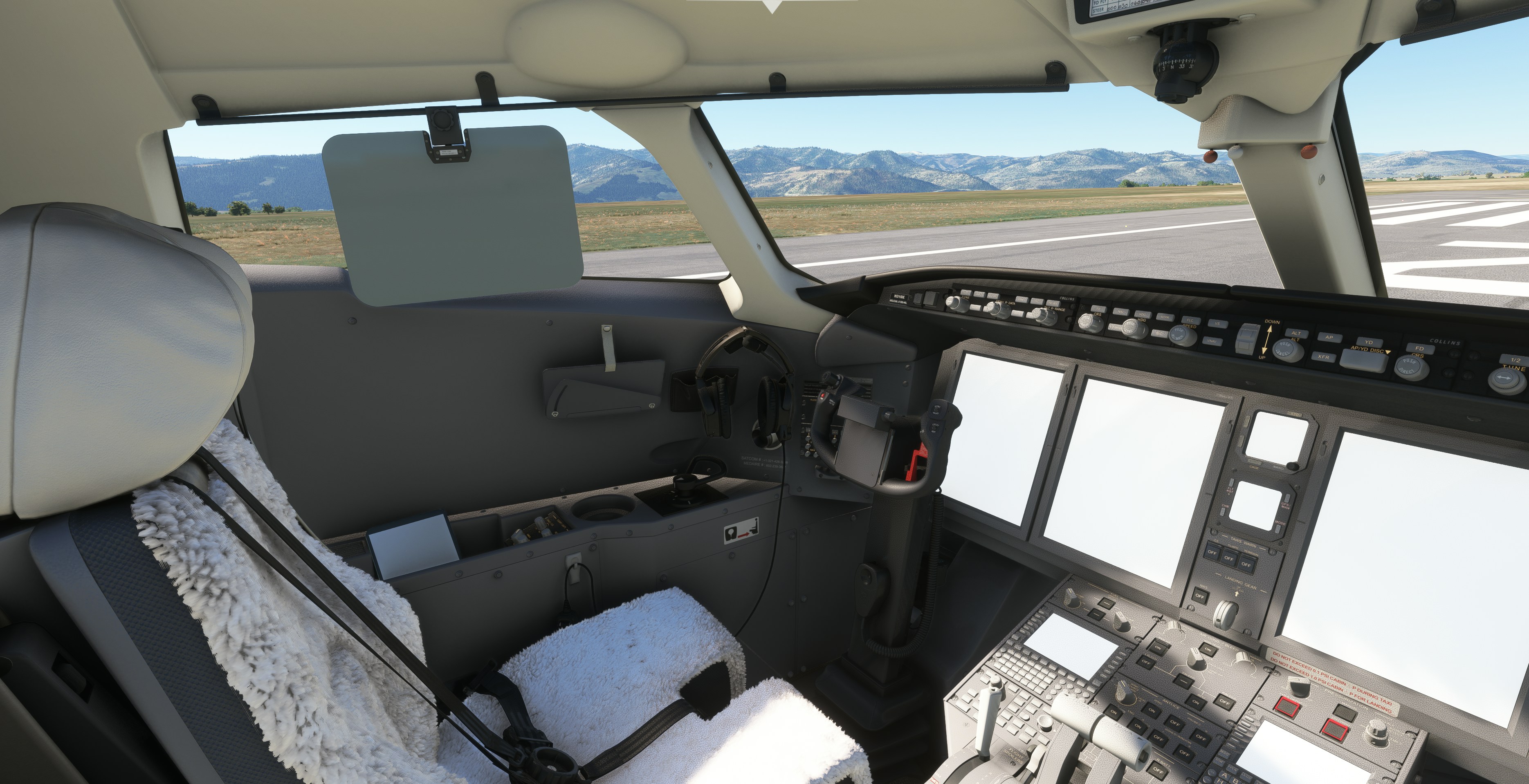 Ce cockpit semble vraiment très bien arriver. Bien que les affichages de vol ne fonctionnent pas encore et soient simplement représentés comme des carrés blancs dans ces images, ce que nous voyons est le niveau de détail sur les sièges des deux pilotes, une partie du panneau de pilote automatique, un Sunvisor pour ces jours vraiment brillants, et des casques modélisés dans les deux pilotes du cockpit.
