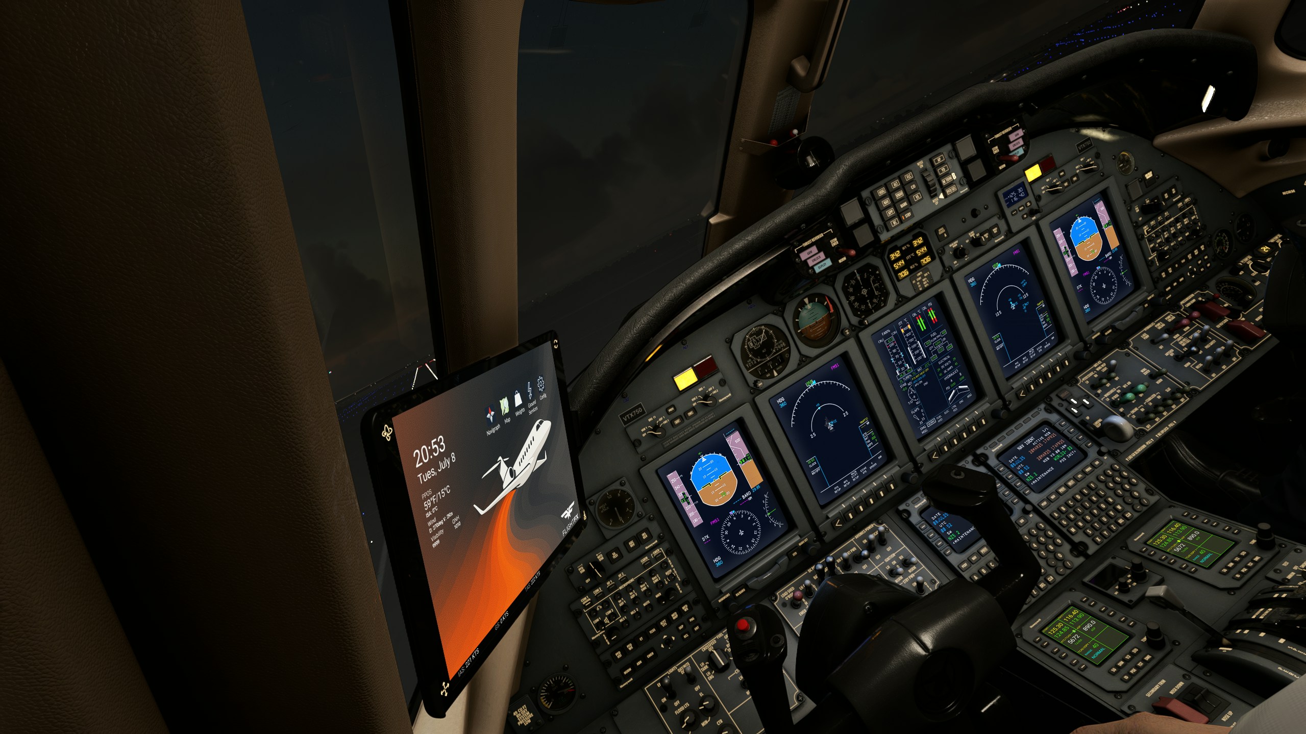 Cela étant dit, cependant, les captures d’écran représentent une interprétation étonnante du jet d’affaires. Nous pouvons voir que le FlightFX EFB, qui a fait ses débuts dans le Piaggio, est de retour. Visibles sont des options pour définir des poids, afficher les diagrammes de navigraphe, se connecter avec les services au sol et les paramètres de configuration d’accès. Une image en particulier du tableau de bord de vol montre à quel point l’attention des détails est portée dans l’avion.
