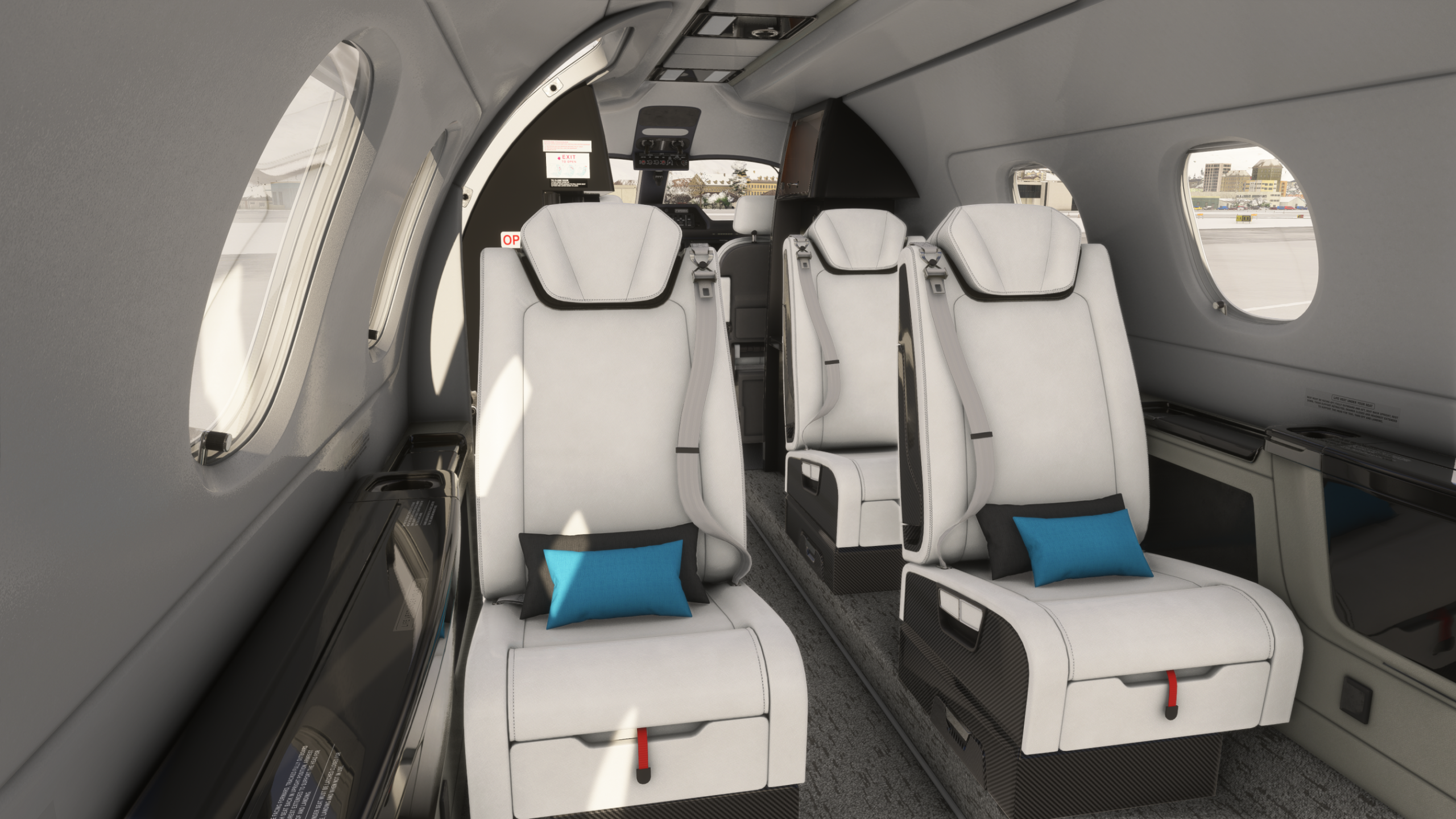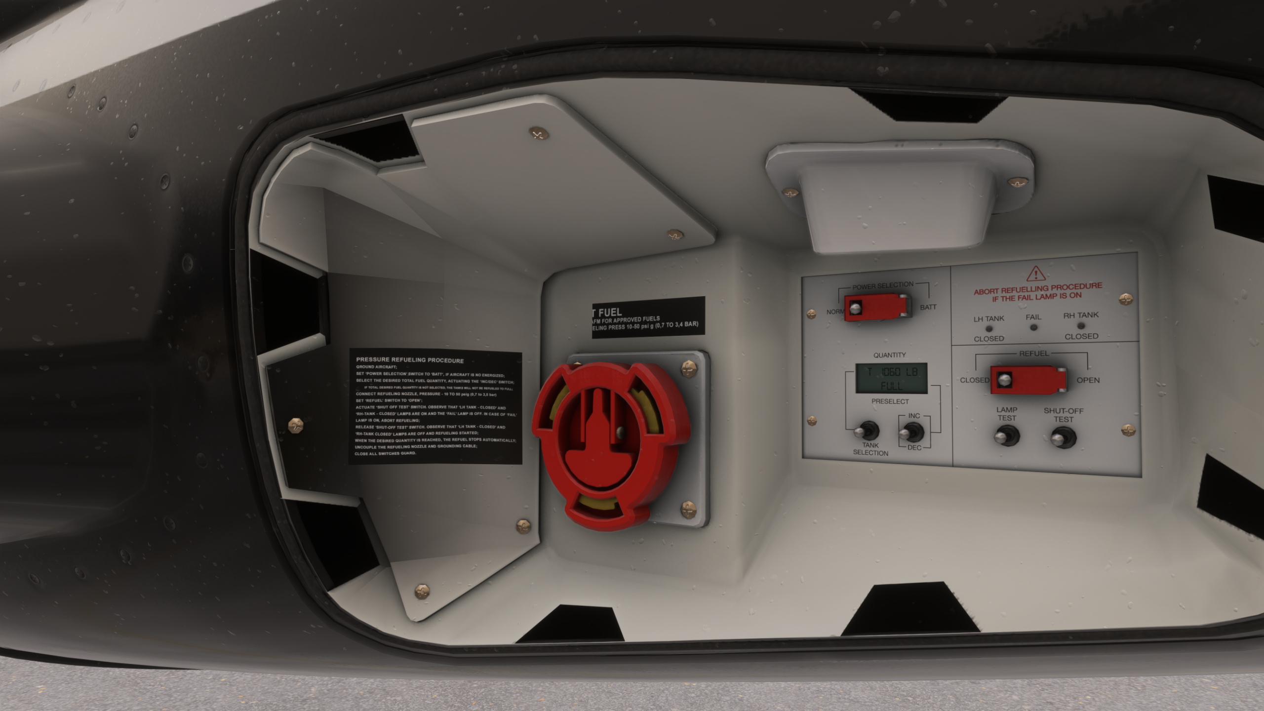 Le modèle 3D et les textures de l’avion utilisent de nouvelles techniques qui tirent parti du niveau de détail pris en charge par MSFS 2024. L’ensemble de la zone de la cuisine comporte des endroits cliquables, notamment des portes de presse fonctionnelles, des machines à café et des tables. Le modèle extérieur comprend des trappes accessibles via le mode walkaround MSFS 2024 et présente des effets de pluie sur toutes les surfaces.