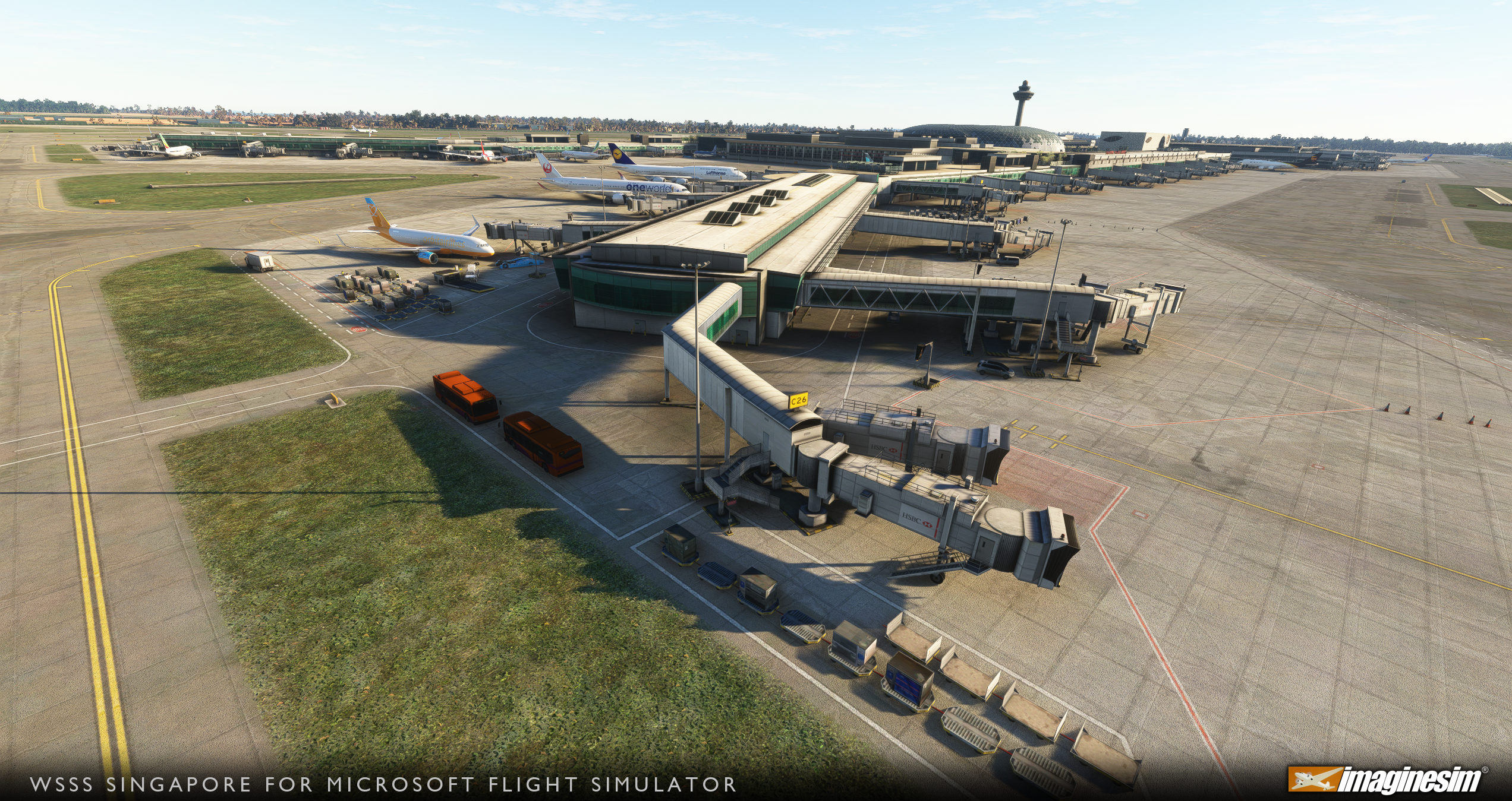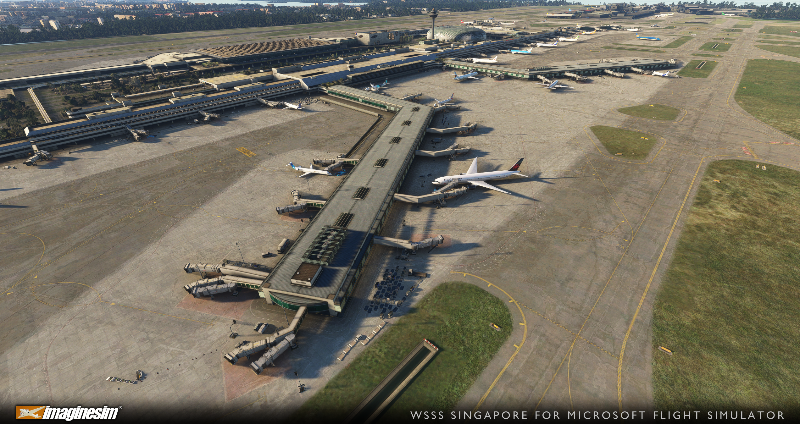 Le décor comprend une configuration d’aéroport mise à jour et ressemble bien aux modifications récemment apportées et aux changements qui vont être effectués dans un avenir proche. Imaginesim WSSS version 2026 comprend 13 kilomètres de nouvelles voies de circulation, y compris les voies de circulation de fin de contour (EAT) pour la piste 02C/20C et les voies de circulation à double liaison qui relieront les terminaux existants au terminal 5. Le chantier de construction du terminal 5, des textures de bâtiments haute définition, des passerelles interactives sur mesure et un système VDGS personnalisé sont également intégrés au paysage. La zone de couverture s’étend sur 52 kilomètres carrés, avec des bordures de terrain graduées conçues pour se fondre parfaitement avec les améliorations vectorielles.