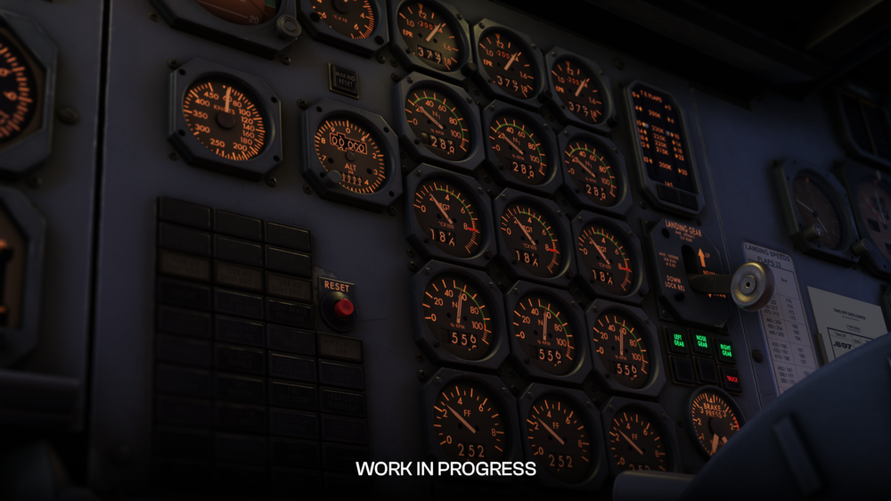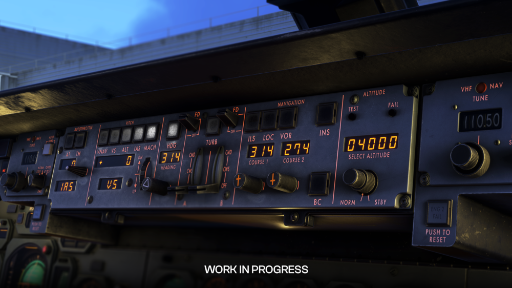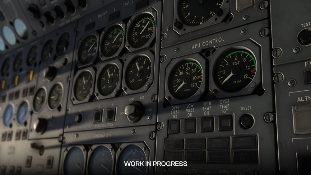 Le cockpit recréera le poste de pilotage du L-1011-500 avec des matériaux haute résolution et une modélisation d’usure limitée. Les textures comprendront des étiquettes vieillies, de la peinture écaillée, des protections d’interrupteur polies et de la crasse accumulée informée par une référence photographique. L’éclairage est calibré à l’aide de valeurs d’intensité physiques pour rester cohérent avec l’époque de l’avion tout en tirant parti des capacités d’éclairage de Microsoft Flight Simulator 2024.