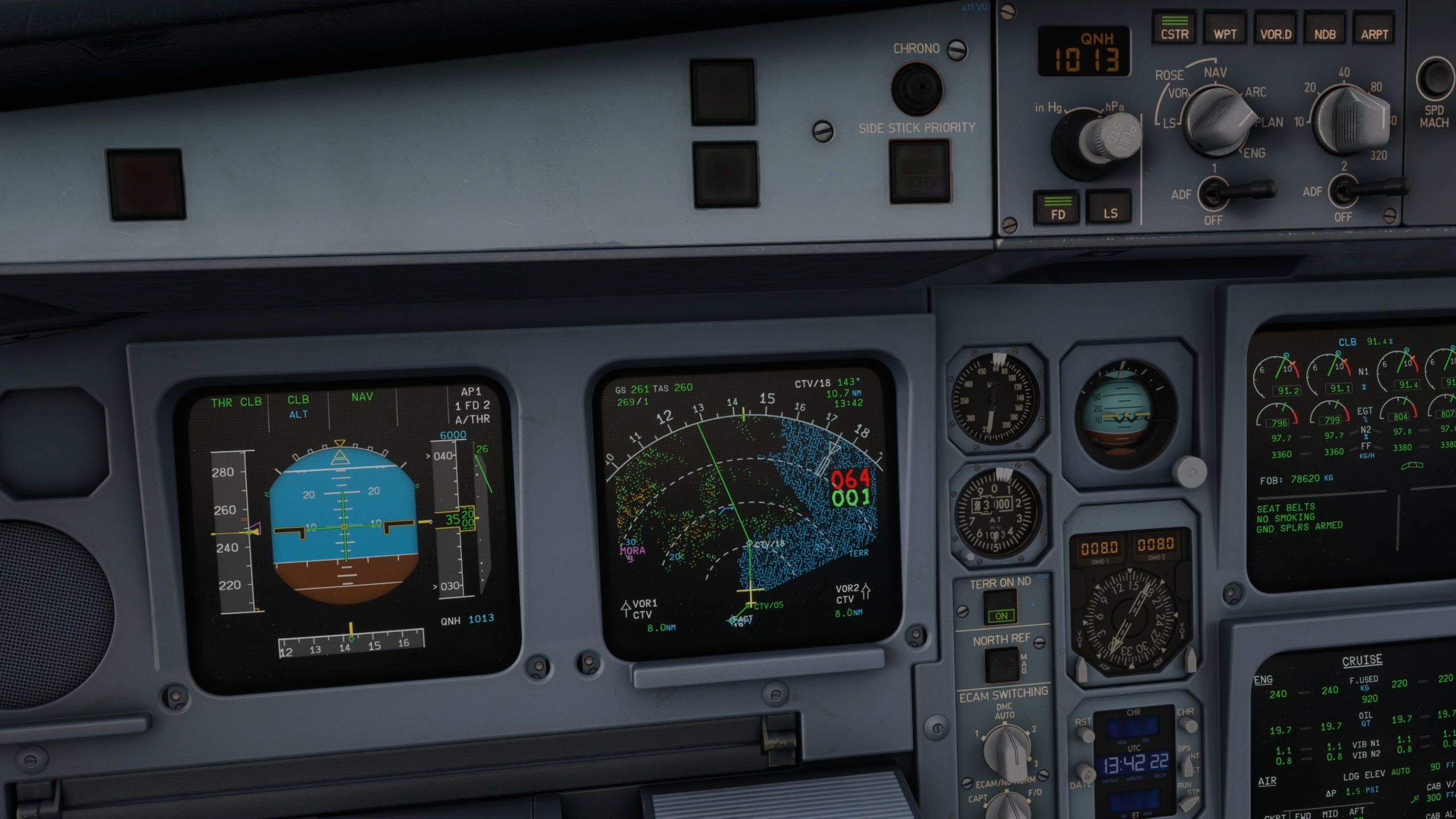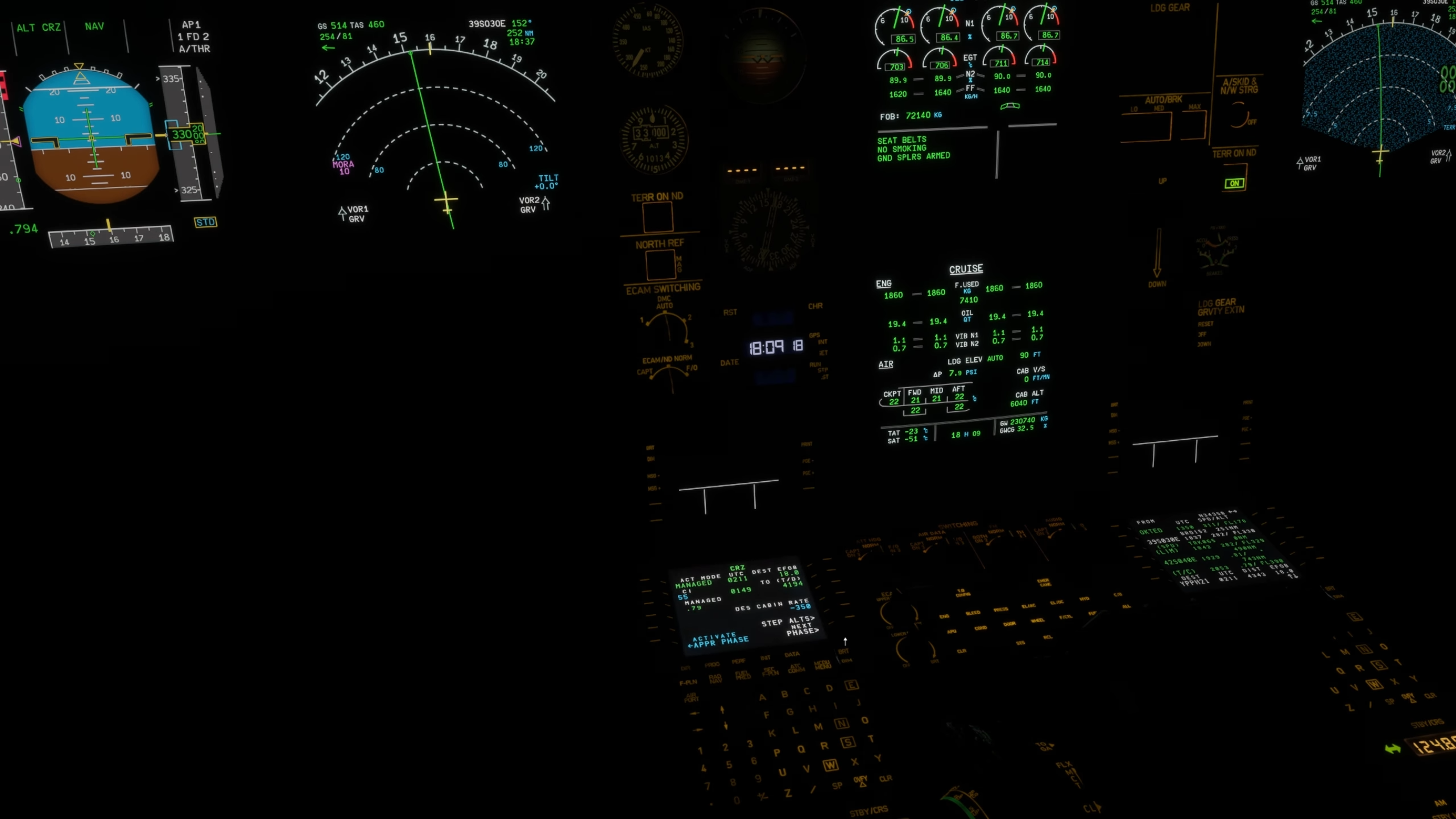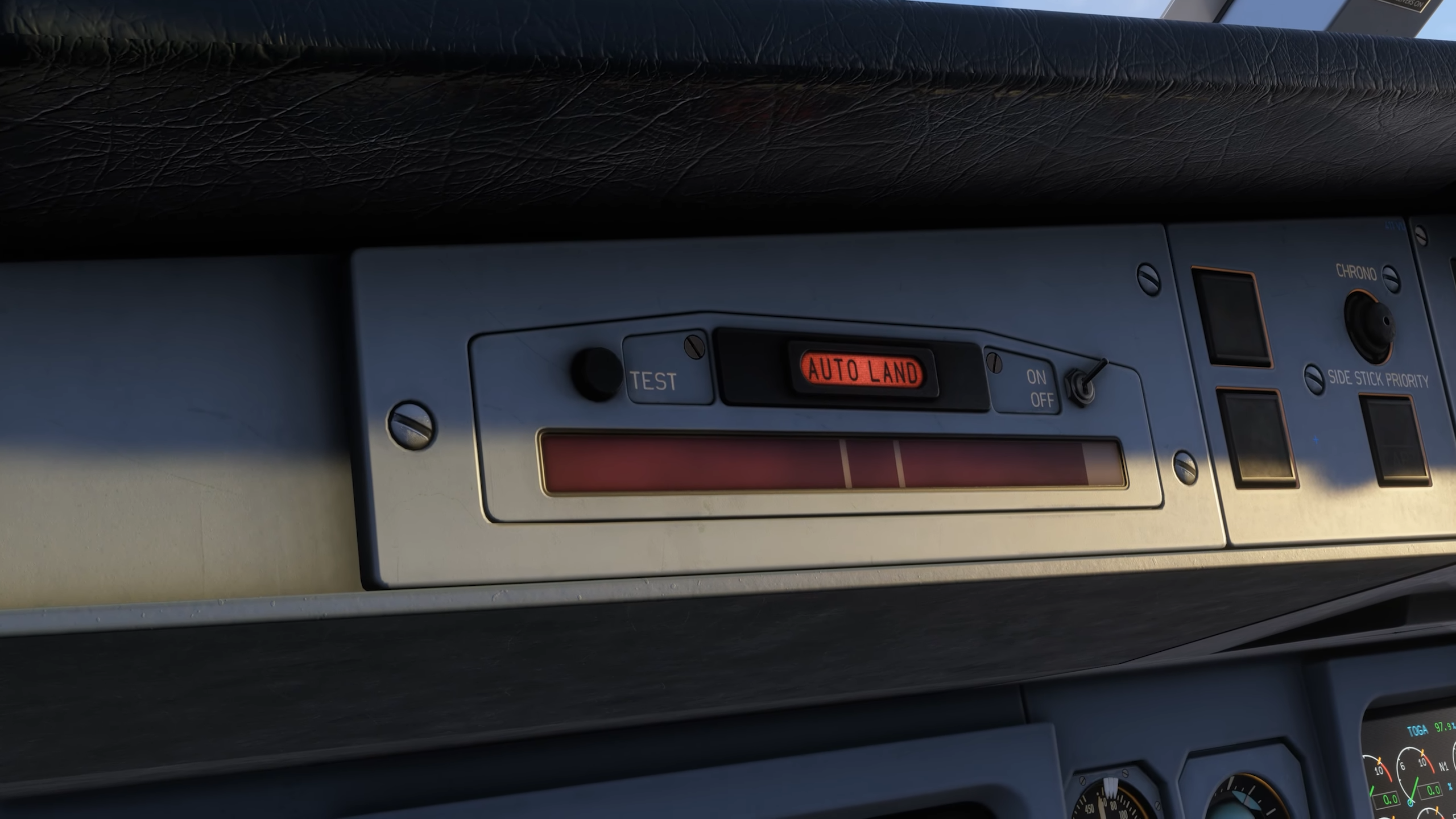 Comme pour le reste de l’avion, le poste de pilotage dispose du même niveau de détail pour la texture et la modélisation, avec des textures haute résolution et des motifs d’usure réalistes sur les commutateurs et les panneaux. Les anciens affichages CRT EIS1 de l’A340 sont disponibles en option pour cet avion, ainsi que les bizarreries et les différences présentes entre les écrans LCD EIS1 et plus récents. L’ancien système est plus lent pour répondre aux changements de page, et les écrans sont incurvés et ont des graphiques à basse résolution.