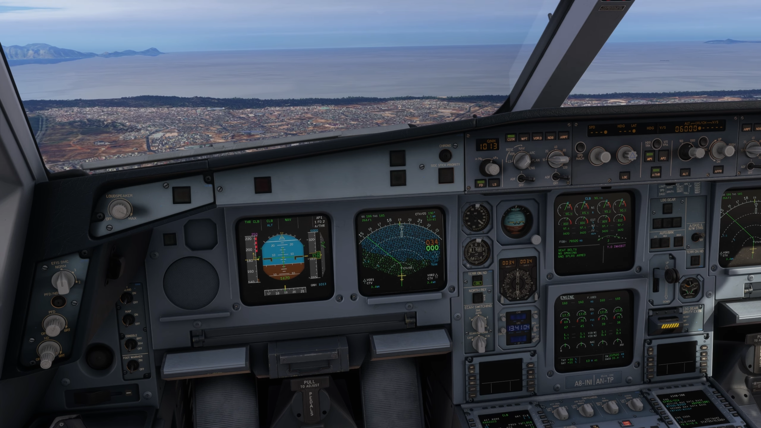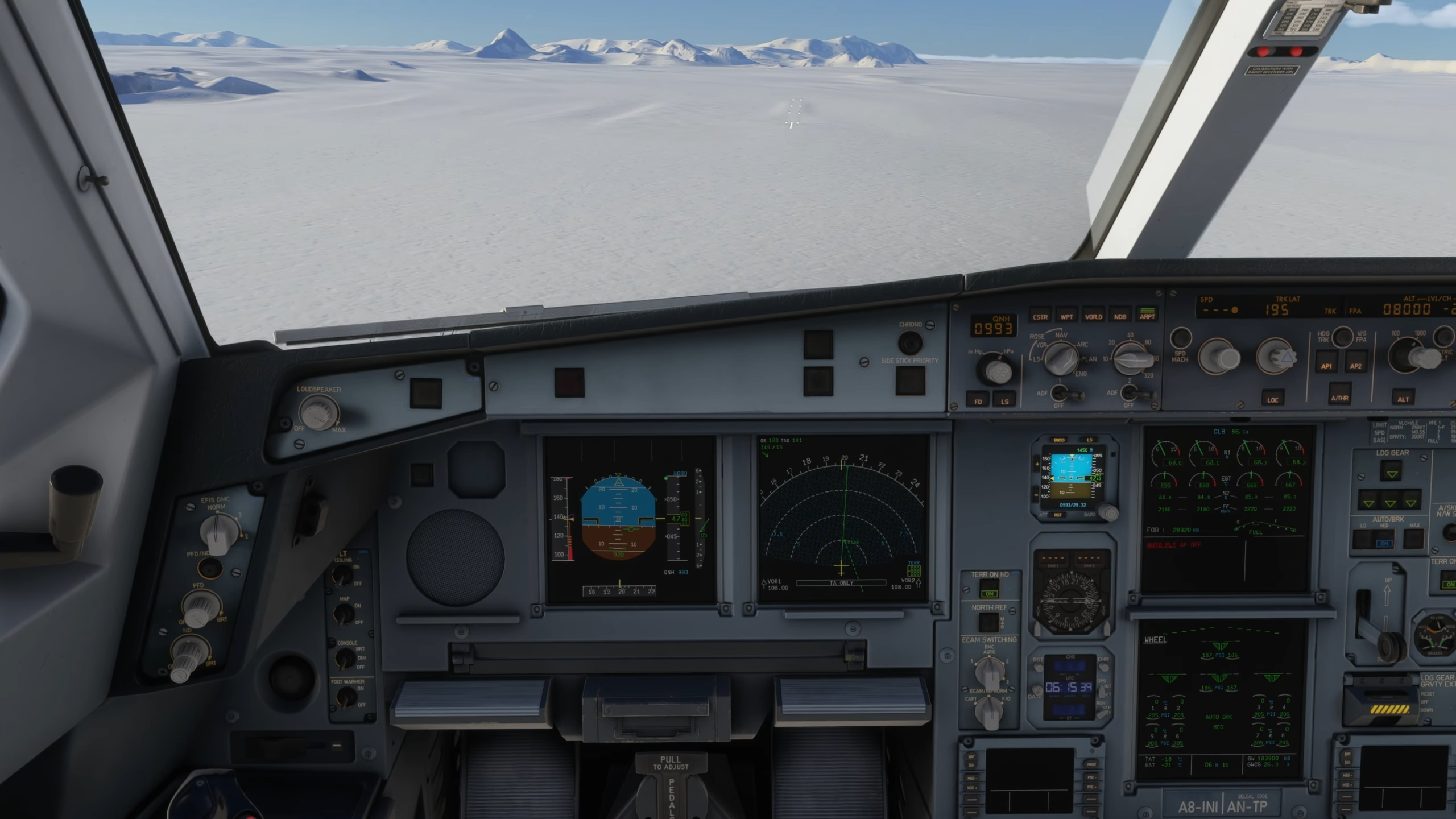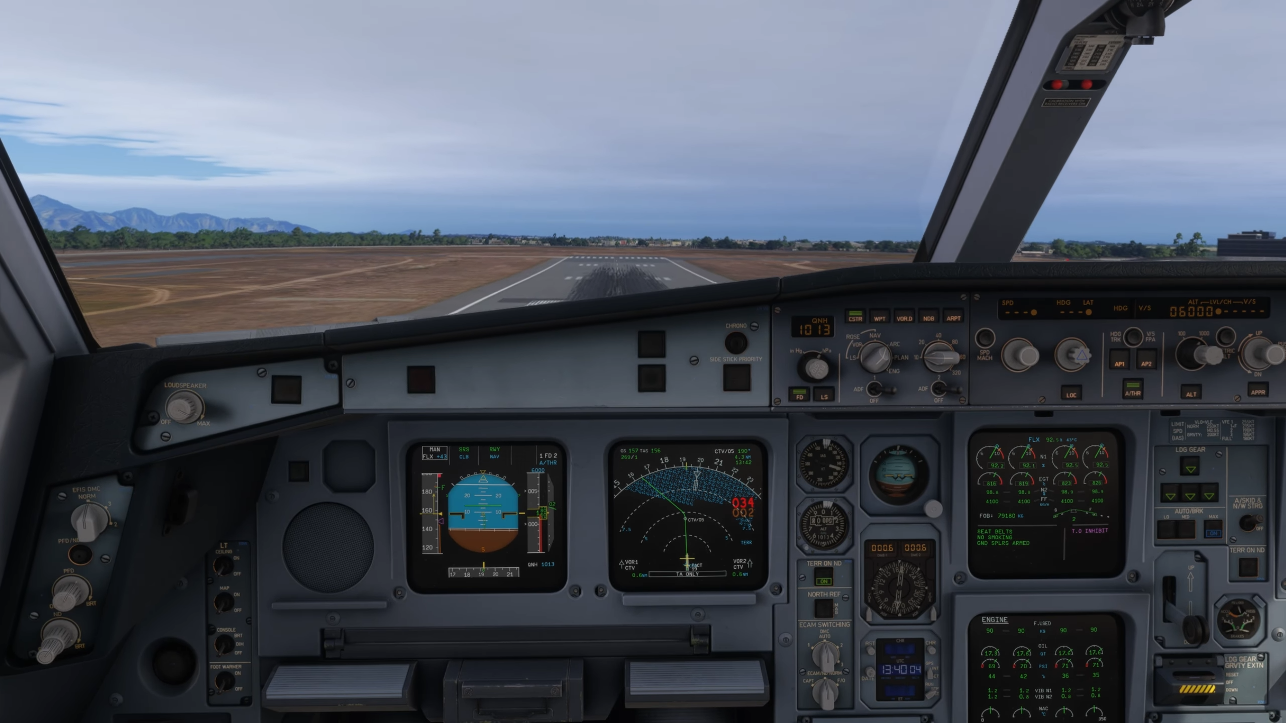 Comme pour le reste de l’avion, le poste de pilotage dispose du même niveau de détail pour la texture et la modélisation, avec des textures haute résolution et des motifs d’usure réalistes sur les commutateurs et les panneaux. Les anciens affichages CRT EIS1 de l’A340 sont disponibles en option pour cet avion, ainsi que les bizarreries et les différences présentes entre les écrans LCD EIS1 et plus récents. L’ancien système est plus lent pour répondre aux changements de page, et les écrans sont incurvés et ont des graphiques à basse résolution.