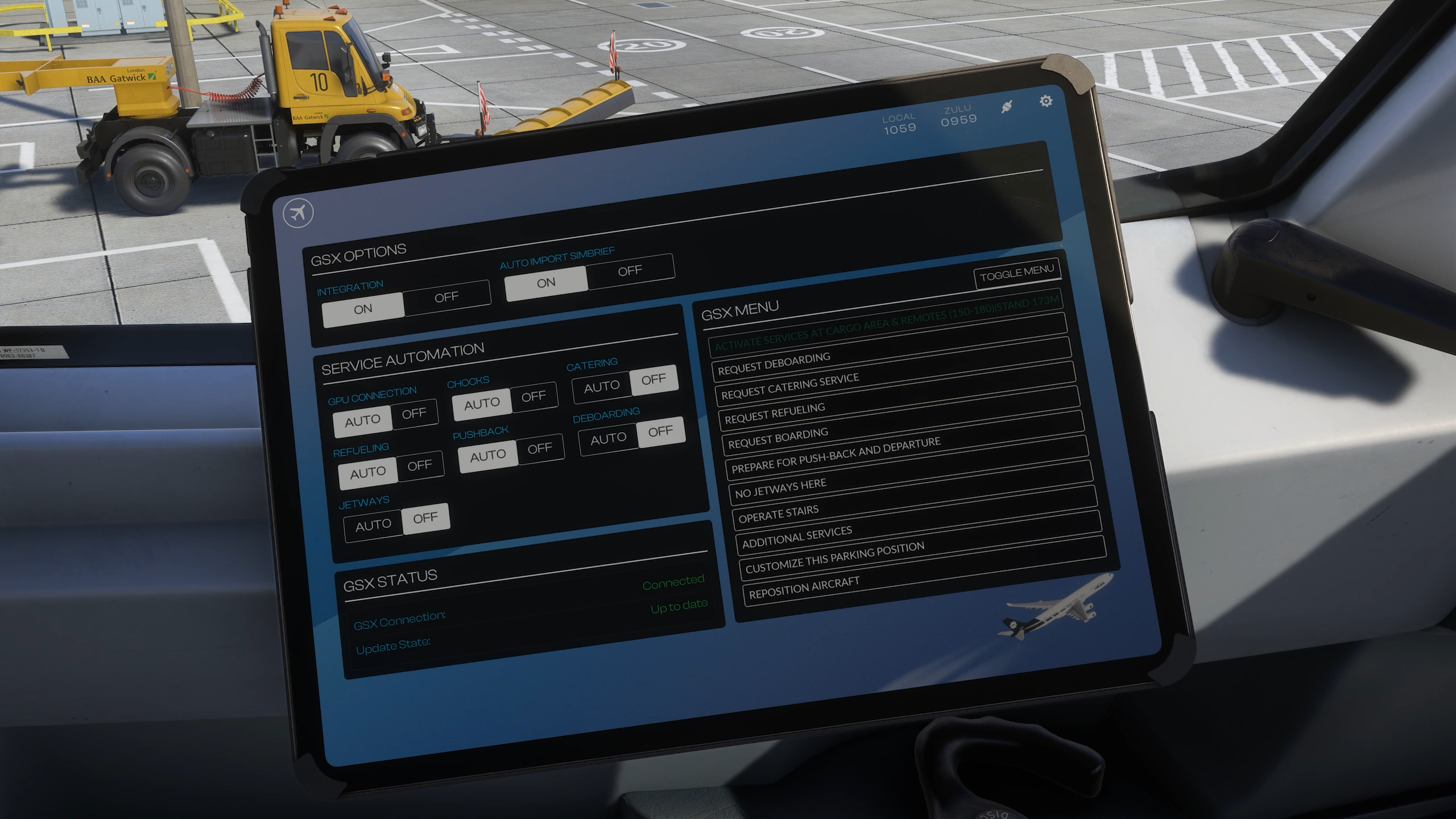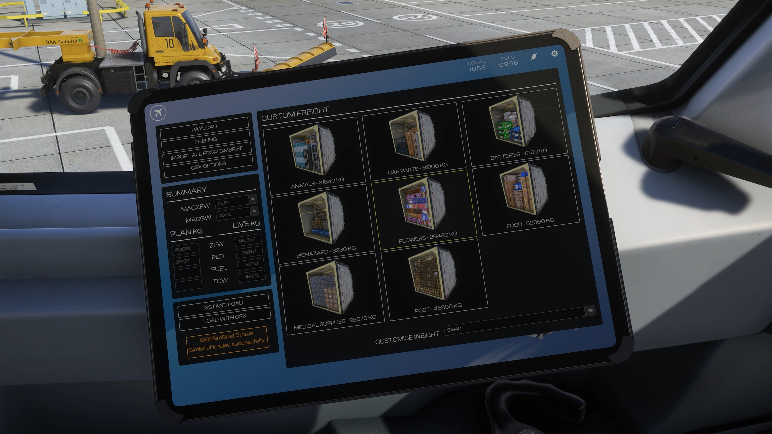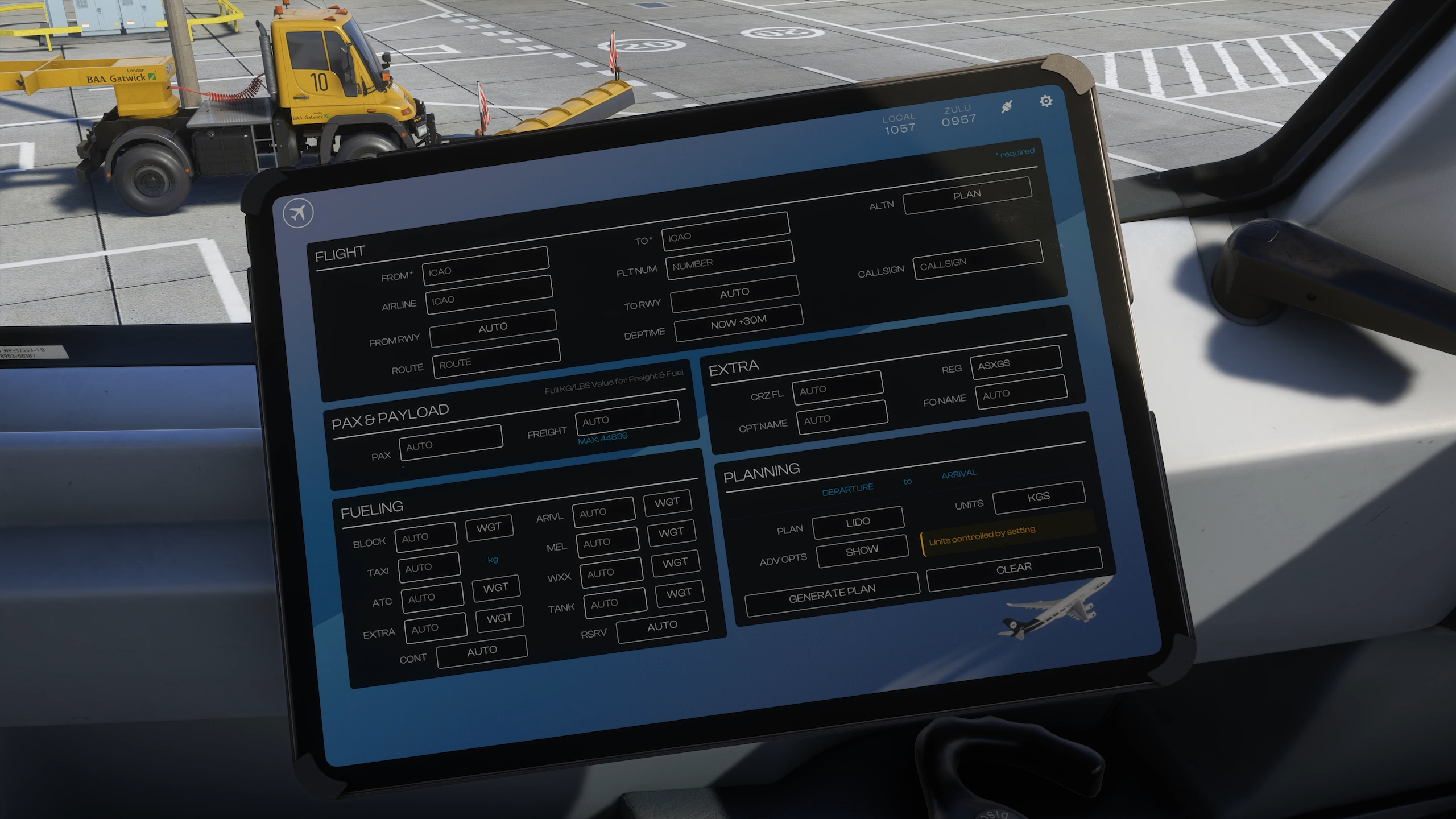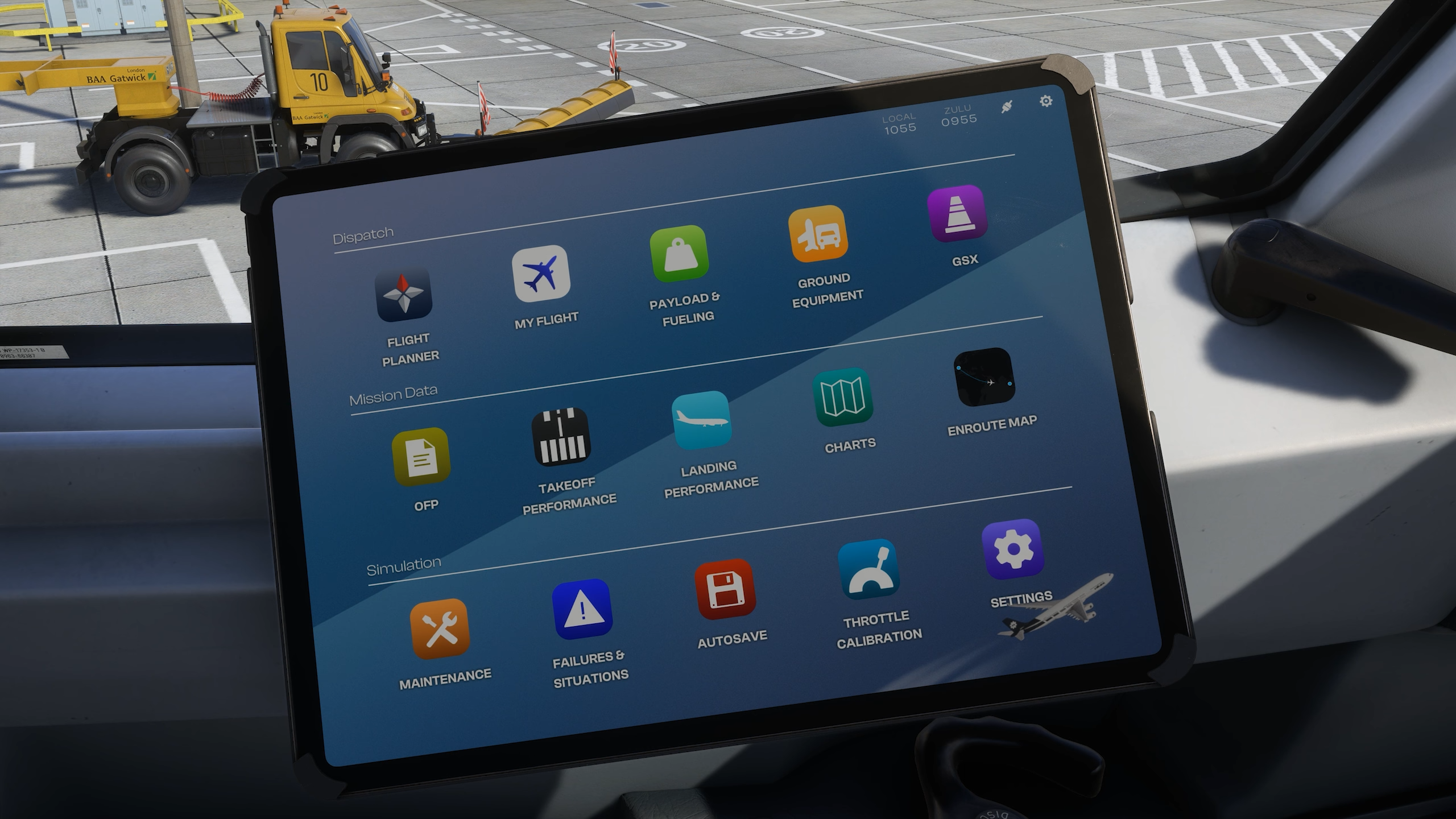 L’application Ground Equipment vous permet d’ouvrir les portes et de configurer l’usure visuelle de l’avion et l’accumulation de saleté. Cet EFB présente la prise en charge native de GSX, qui peut être contrôlée à partir de son application dédiée. La configuration de la charge utile, qui peut être téléchargée à partir de Simbrief, est définie dans l’application de poids et d’équilibre.