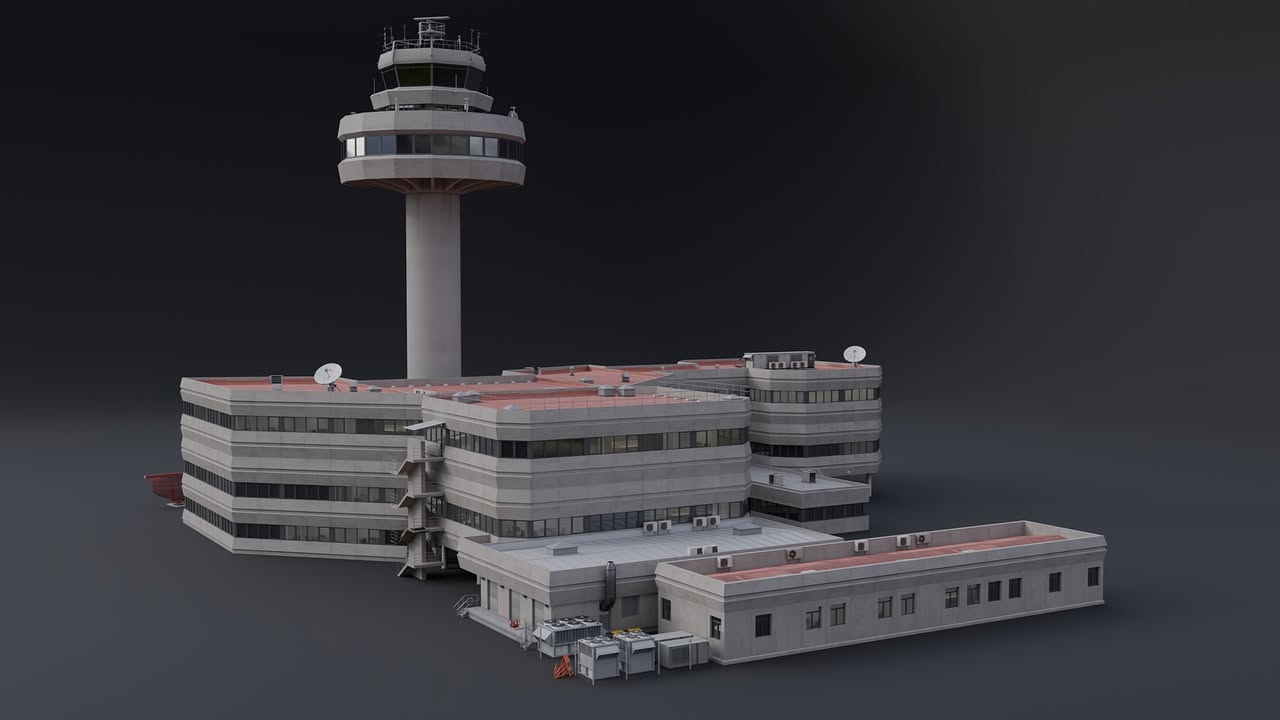 Les deux captures d’écran montrent le bâtiment de la tour de contrôle de l’aéroport dans un environnement non simulé, avec un fond vierge. Pyreegue est connu pour ses paysages détaillés, avec de nombreuses animations et petits avantages, qui rendent leurs aéroports impossibles à distinguer de la réalité.
